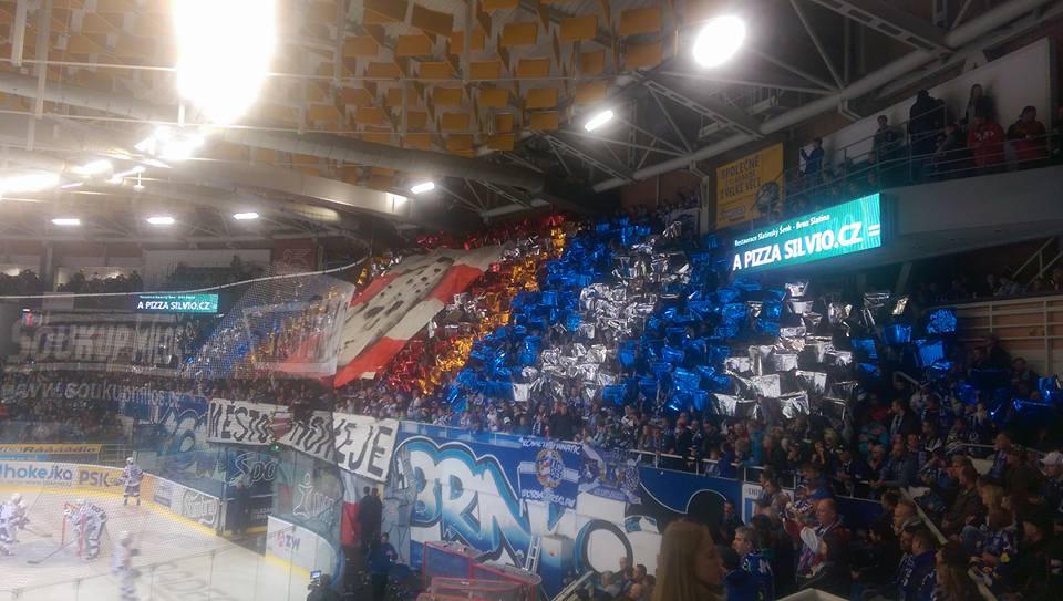 Na stupínku máme dva speakery a rozjíždíme support. Hned ve 4. minutě otevírá skóre Honza Hruška a fandíme ještě o něco více. Vládci moravských kurniků vypsali invazi do Brna "VŠICHNI V BÍLÉM", ale já moc bílích triček v sektoru nespatřil. Slipky ani nedokázali naplnit hostující sektor a nepřipravili si žádnou prezentaci. Ke konci 1. třetiny přidávají další dva góly Erat s Kvapilem a jdem do kabin za stavu 3:0. O přestávce strháváme nápisy a vyvěšujeme vlajky Ultras Patriots Brno, Gioventu, Modrobílí, Modrobílá Šlechta a divizní vlajky: Břeclav, Jedovnice a Dětkovice.